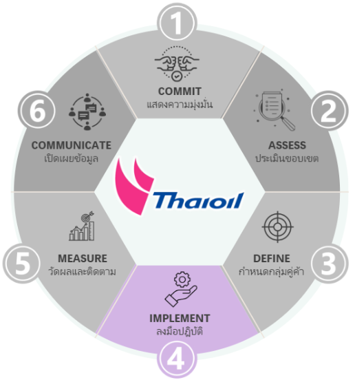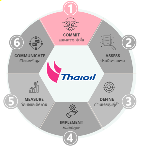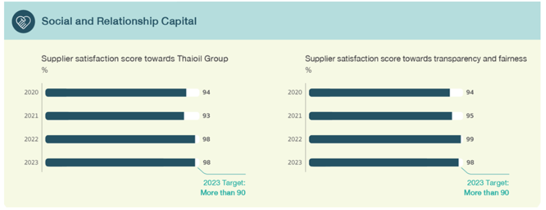 ยิ่งไปกว่านั้น แนวปฏิบัติในการจัดซื้อจัดจ้างและสัญญาต่อคู่ค้าได้รับการทบทวนอย่างสม่ำเสมอ เพื่อให้แน่ใจว่าสอดคล้องกับแนวทางปฏิบัติอย่างยั่งยืนของคู่ค้ากลุ่มไทยออยล์ (SCOC) และเพื่อหลีกเลี่ยงความขัดแย้งที่อาจเกิดขึ้นกับข้อกำหนด ESG