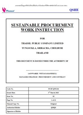 We have a set of procedures and tools, including policies, strategies, roadmaps, procedures, templates, and more, that are aligned with Thaioil Group’s sustainability and procurement objectives. In addition, Thaioil Group uses systems (e.g., SAP Ariba, TOPTEN, Contractor Management System, SRM Platform, etc.) to support our workflows and procedures.