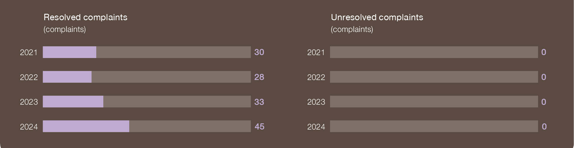 In 2024, there is 45 complaints from the communities. According to the grievance mechanism procedure, the Company investigated and resolved all the submitted complaints, established prevention measures, and notified the complainants of the result.