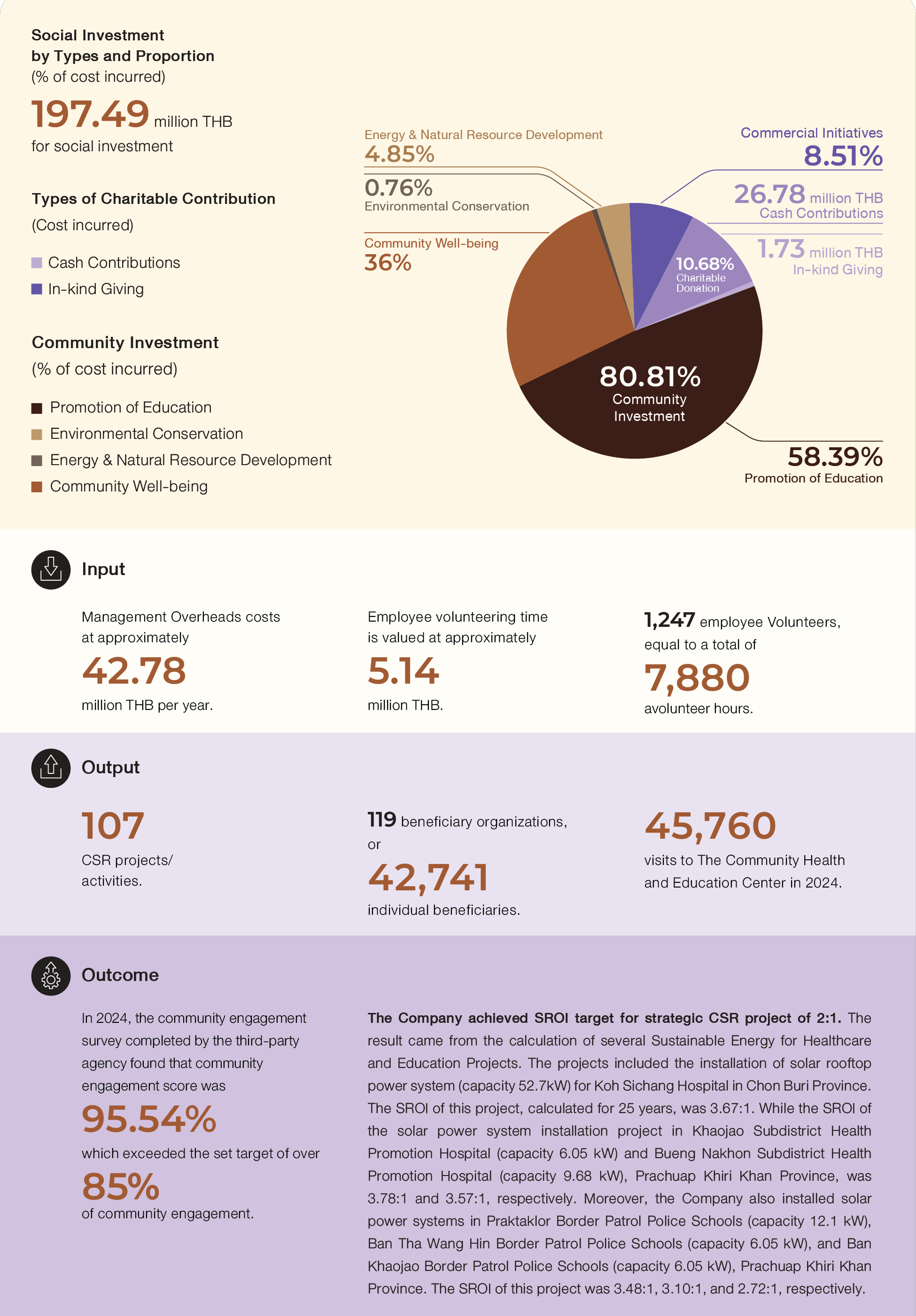 In addition, Thaioil Group has developed an integrated community development plan through projects and activities in the areas of social and cultural engagement, health promotion, quality of life, education, and the environment. Furthermore, Thaioil Group has adopted the social return on investment (SROI) concept to assess the effectiveness of community programs in a systematic manner.