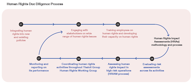 Thaioil Group has conducted a comprehensive human rights risk assessment under the Enterprise Risk Management process, which is aligned with the international UN principles through the Thaioil Group Human Rights Impact Assessment and Management (HRIAM) procedure for human rights due diligence. The human rights risk assessment has been comprehensively implemented across the business operation and suppliers in the Company’s supply chain for every three years and monitored on an annual basis.