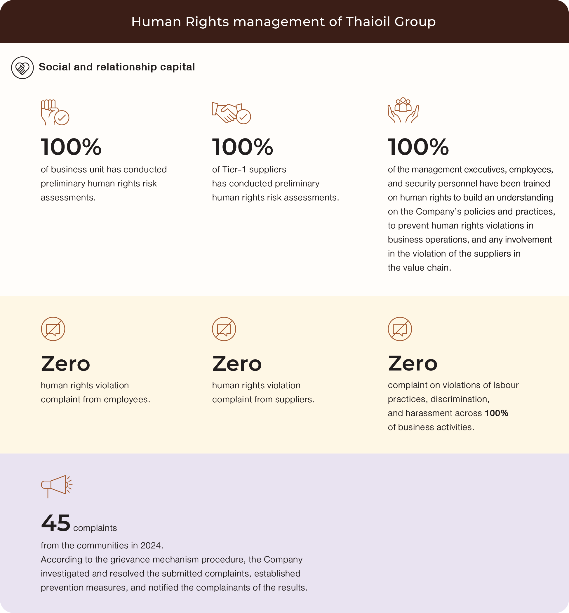 Thaioil Group is committed to adhering to both international and Thai frameworks and principles of human rights. This ensures that the enhancement of production capacity under the Clean Fuel Project (CFP), as well as business expansion into international markets, aligns with the Company’s strategies and poses no risk of human rights violations against stakeholders. These risks include employment and labour practices, migrant worker and forced labour issues, community rights, employee engagement and equality, environment rights, and differences in legal frameworks in the countries where the Company operates. For these reasons and to address the potential risks that may arise, Thaioil Group has established an action plan in accordance with the international human rights framework as well as the 2nd National Action Plan on Business and Human Rights to sustainably elevate and prioritize the prevention and protection of human rights for all stakeholders.