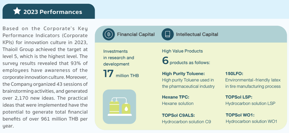 In response to the Company’s business strategies, Thaioil Group has focused on creating new innovations as a cornerstone to foster sustainable business growth. Hence, the Company places importance on “innovation” by prioritizing and empowering employees to develop creative solutions and invent new ideas and innovations to deliver value-added products and services in the future.
