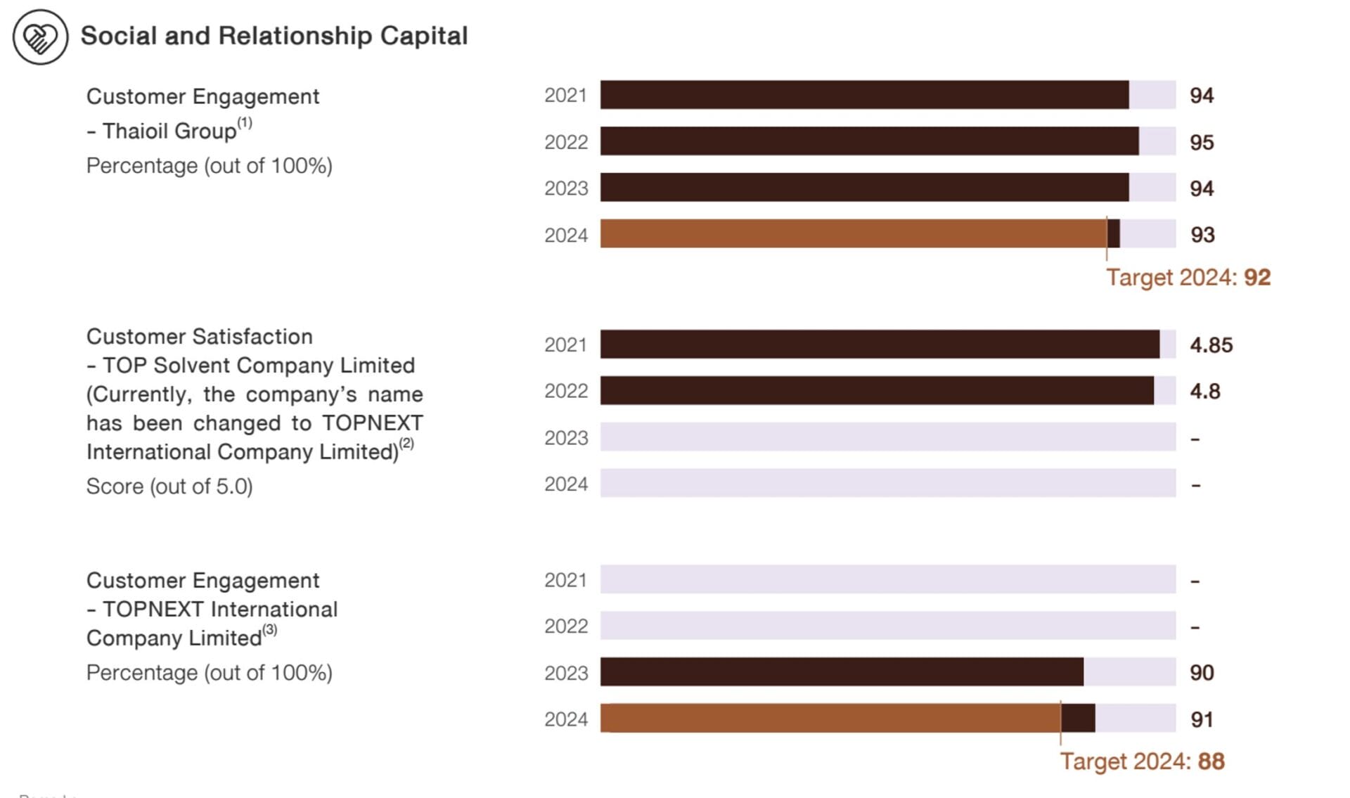 (1) Customer engagement of Thaioil Group consists of Thai Oil Public Company Limited (TOP), Thai Lube Base Public Company Limited (TLB), and Thai Paraxylene Company Limited (TPX). This survey was conducted by a third-party company that provides customer satisfaction assessment services.