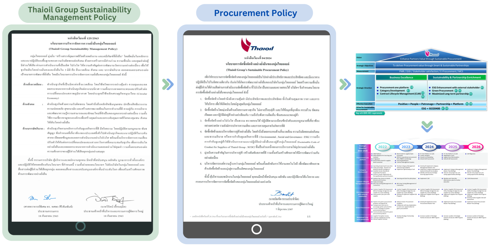 กลยุทธ์ด้านสิ่งแวดล้อม สังคม และธรรมาภิบาล ยังครอบคลุมถึงการจัดซื้อจัดจ้าง โดยได้มีการกำหนดนโยบายการจัดซื้อจัดจ้างอย่าง ยั่งยืนของกลุ่มไทยออยล์ซึ่งอนุมัติโดยประธานเจ้าหน้าที่บริหารและกรรมการผู้จัดการใหญ่ และสื่อสารผู้ที่เกี่ยวของผ่าน แนวทางกลยุทธ์ จัดซื้อจัดจ้างประกอบไปด้วย supply chain ESG strategy และ supplier ESG Program.