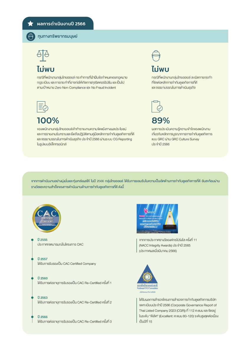 จัดกิจกรรมเพื่อให้ความรู้ด้านกฎหมาย และส่งเสริมพฤติกรรมการปฏิบัติงานที่โปร่งใส เป็นธรรม ปราศจากคอร์รัปชัน ตลอดปี 2567 เช่น จัดอบรมให้ความรู้เรื่องมาตรการคว่ำบาตรทางและการต่อต้านการฟอกเงิน (Sanction and Anti-Money Laundering) จัดอบรมให้ความรู้เรื่องข้อกำหนดทางการค้าระหว่างประเทศ (Incoterms®) จัดอบรมให้ความรู้เกี่ยวกับการทำงานแบบ GRC และความรู้ในเชิงปฏิบัติการในเรื่อง No Gift Policy เรื่อง Conflict of Interest เรื่องกระบวนการ Whistleblowing เรื่องกระบวนการจัดซื้อจัดจ้าง และเรื่องนโยบายและระเบียบปฏิบัติด้านการบุคคล ข้อบังคับเกี่ยวกับการทำงาน และนโยบายด้านสิทธิมนุษยชนของกลุ่มไทยออยล์ จัดให้มีการสื่อสาร CG Do & Don’t ตัวอย่างพฤติกรรมที่ควรทำและไม่ควรทำของแต่ละจรรยาบรรณในการดำเนินธุรกิจ เป็นต้น