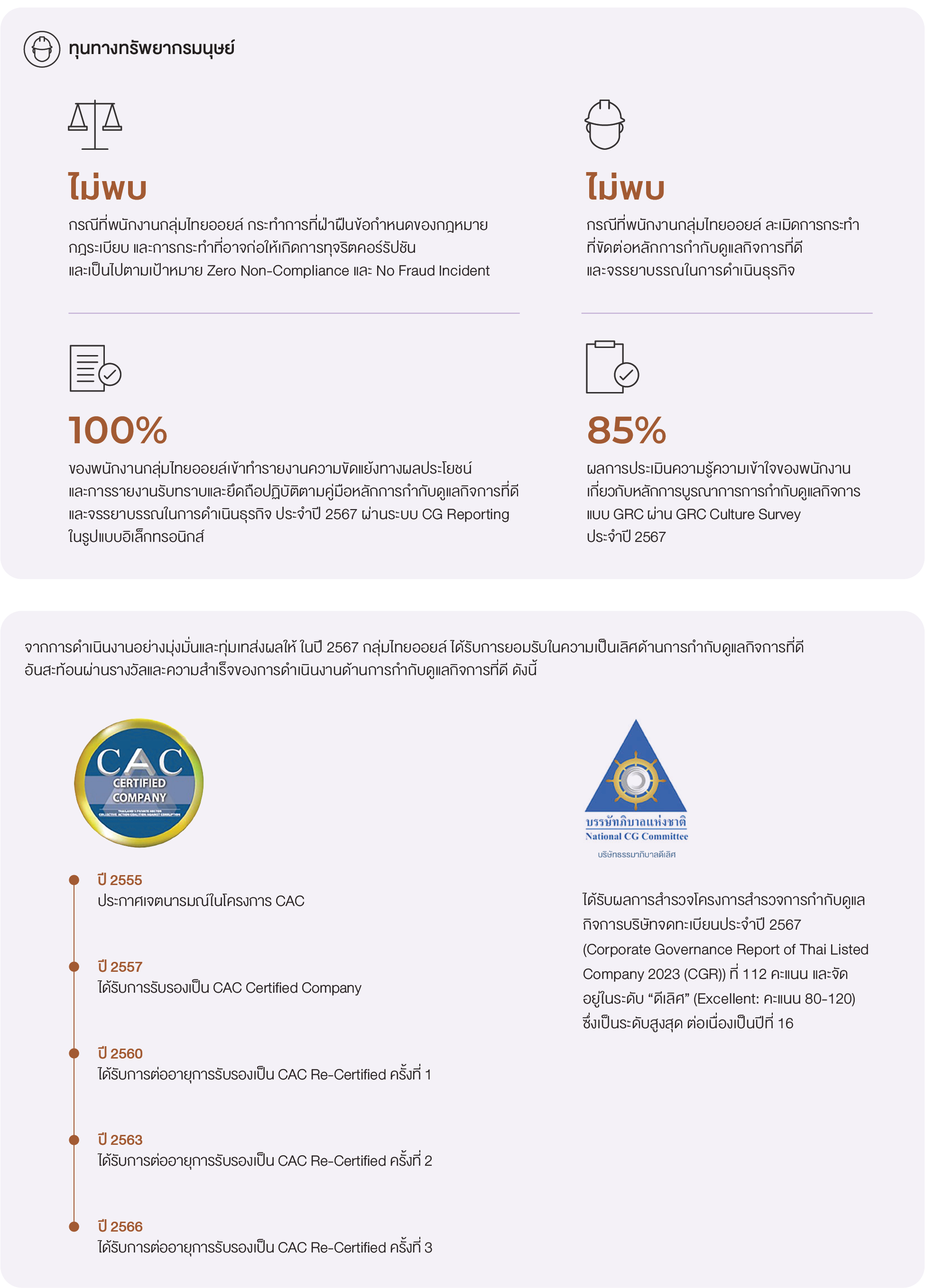 โดยในปี 2567 คณะกรรมการกำกับดูแลกิจการที่ดีและการพัฒนาอย่างยั่งยืนได้อนุมัติการปรับปรุงกระบวนการบริหารจัดการเรื่องร้องเรียน ให้มีความชัดเจน สามารถบริหารจัดการได้อย่างมีประสิทธิภาพมากยิ่งขึ้น นอกจากนี้ กลุ่มไทยออยล์ยังได้กำหนดให้มีมาตรการคุ้มครองผู้แจ้งเรื่องร้องเรียน ผู้แจ้งเบาะแส หรือบุคคลที่เกี่ยวข้องที่เหมาะสมและเป็นธรรมจากกลุ่มไทยออยล์ เช่น ไม่มีการเปลี่ยนแปลงตำแหน่งงาน ข่มขู่ รบกวนการปฏิบัติงาน เลิกจ้าง หรือการกระทำอื่นใดที่ไม่เป็นธรรม กลุ่มไทยออยล์จะเก็บรักษาข้อมูลเกี่ยวกับเรื่องร้องเรียนเป็นความลับ และไม่เปิดเผยต่อผู้ไม่เกี่ยวข้อง เว้นแต่ที่จำเป็นต้องเปิดเผยตามข้อกำหนดของกฎหมาย โดยมีเรื่องร้องเรียนที่ตรวจสอบคงค้างจากปี 2566 จำนวน 2 เรื่อง โดยผลจากการพิจารณาสืบสวนข้อเท็จจริงตามกระบวนการบริหารจัดการเรื่องร้องเรียน ไม่พบการกระทำความผิด 1 เรื่อง และพบการกระทำผิด 1 เรื่อง โดยเป็นการกระทำผิดเกี่ยวกับการฝ่าฝืนจรรยาบรรณในการดำเนินธุุรกิจ ซึ่งพบว่าเป็นการกระทำความผิดวินัยตามนโยบายและระเบียบวิธีปฏิบัติด้านการบุคคล และบริษัทฯ ได้พิจารณาโทษทางวินัยอย่างเป็นธรรมและสอดคล้องกับกฎหมายแรงงาน และได้แจ้งผลการพิจารณาให้แก่ผู้ร้องเรียนเรียบร้อยแล้ว