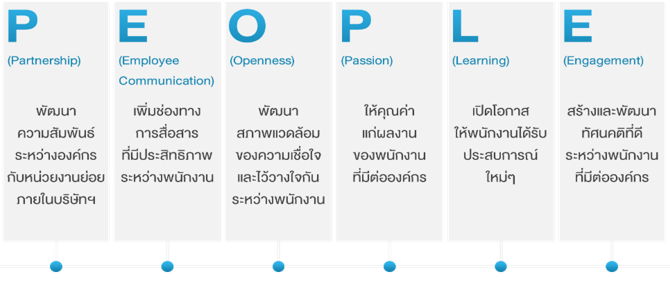 - ด้านประสบการณ์ที่ดีในการทำงาน (People Way of Work)บริษัทฯ ให้ความสำคัญกับการดูแลพนักงานอย่างต่อเนื่อง โดยบูรณาการหลักการ DEI (Diversity, Equity and Inclusion) ร่วมกับวิถีการทำงาน เพื่อให้เกิดความเท่าเทียมและส่งเสริมให้เกิดการทำงานร่วมกันอย่างราบรื่น ตลอดจนมุ่งมั่นยกระดับความผูกพันของพนักงาน และสร้างสมดุลชีวิตการทำงานและชีวิตส่วนตัวอย่างต่อเนื่อง เพื่อยกระดับคุณภาพชีวิตและสร้างความสุขให้กับพนักงานอย่างยั่งยืน