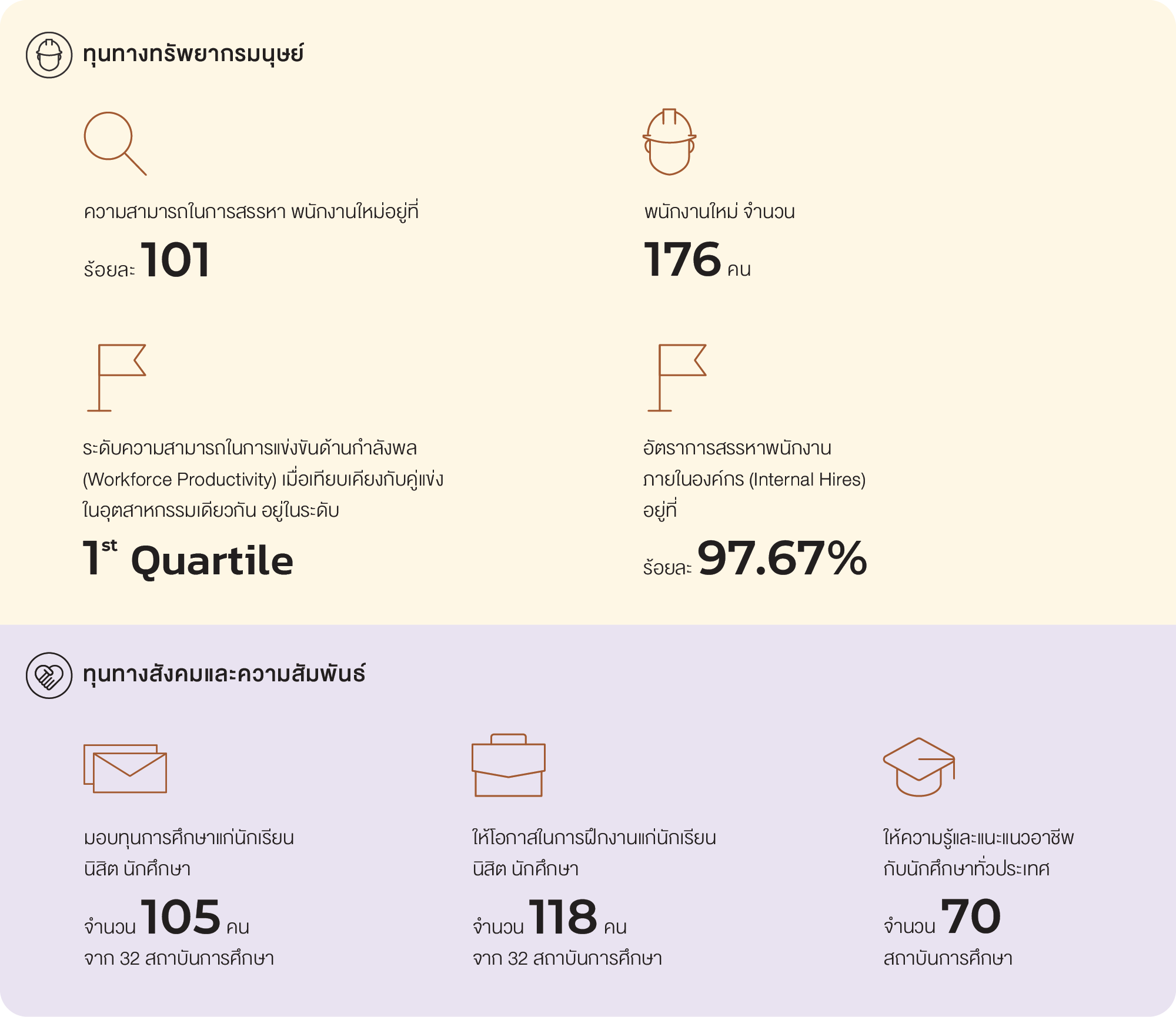 ทุนทางทรัพยากรมนุษย์ | • ความสามารถในการสรรหาพนักงานใหม่อยู่ที่ร้อยละ 101 • ระดับความสามารถในการแข่งขันด้านกำลังพล (Workforce Productivity) เมื่อเทียบเคียงกับคู่แข่งในอุตสาหกรรมเดียวกัน อยู่ในระดับ 1st Quartile • พนักงานใหม่ จำนวน 176 คน • อัตราการสรรหาพนักงานภายในองค์กร (Internal Hires) อยู่ที่ร้อยละ 97.67 | |