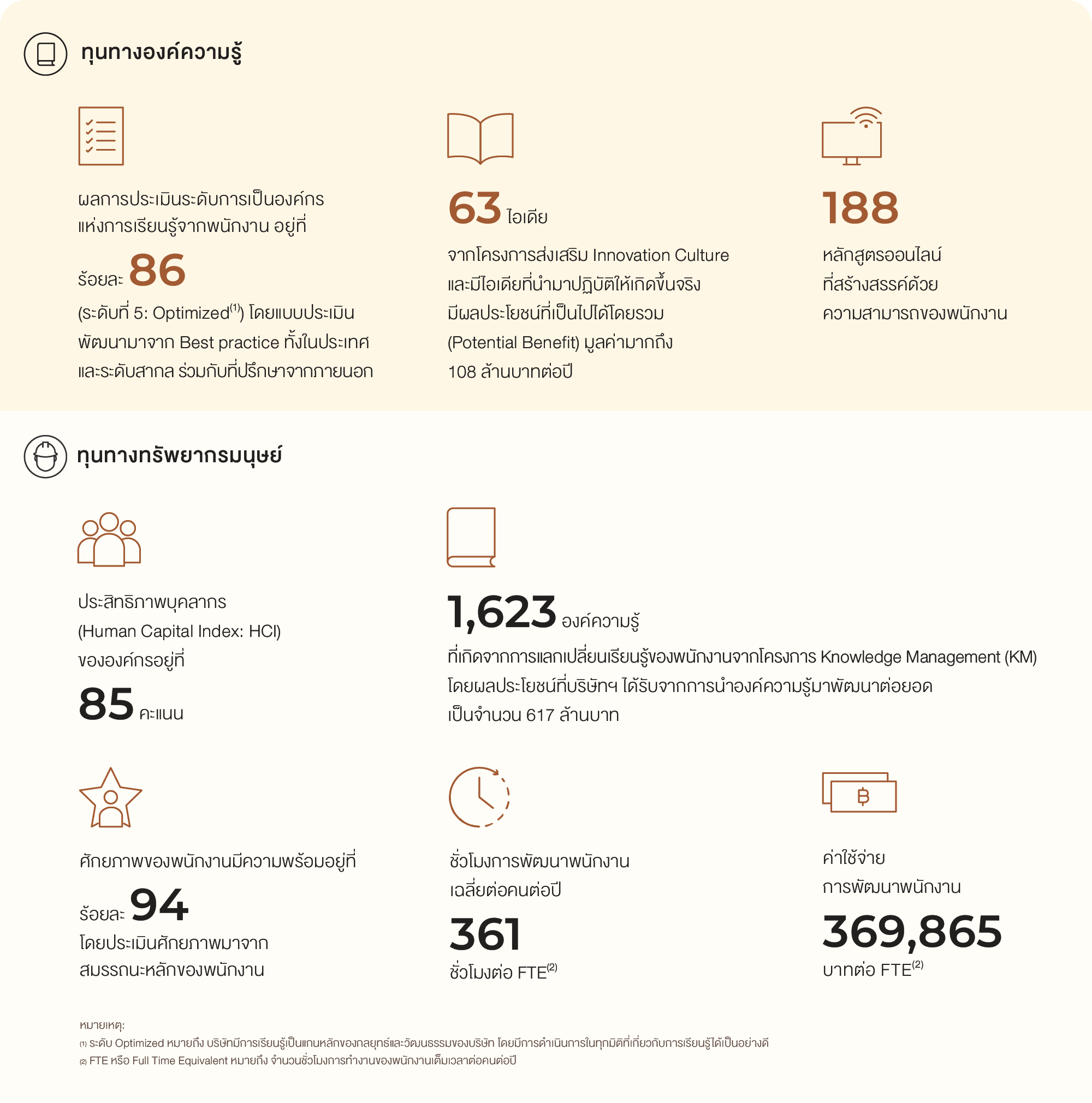 ทุนทางองค์ความรู้ | • ผลการประเมินระดับการเป็นองค์กรแห่งการเรียนรู้จากพนักงาน อยู่ที่ร้อยละ 86 (ระดับที่ 5: Optimized(1)) โดยแบบประเมินพัฒนามาจาก Best Practice ทั้งในประเทศและระดับสากล ร่วมกับที่ปรึกษาจากภายนอก. • 63 ไอเดีย จากโครงการส่งเสริม Innovation Culture และมีไอเดียที่นำมาปฏิบัติให้เกิดขึ้นจริงมีผลประโยชน์ที่เป็นไปได้โดยรวม (Potential Benefit) มูลค่ามากถึง 108 ล้านบาทต่อปี • 188 หลักสูตรออนไลน์ที่สร้างสรรค์ด้วยความสามารถของพนักงาน | |
