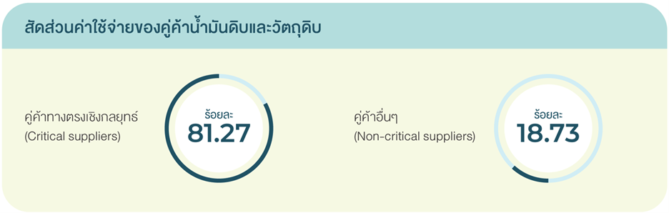 ไทยออยล์มีการจัดแบ่งระดับคู่ค้าน้ำมันดิบและวัตถุดิบ (Supplier Classification) โดยการพิจารณาจากยอดการสั่งซื้อ (Purchase Spending) ร่วมกับระดับความเสี่ยงด้าน ESG ทั้งในลักษณะภูมิศาสตร์ ซึ่งหมายถึงประเทศที่ตั้งอยู่ (Country-specific) และลักษณะอุตสาหกรรม (Sector-specific) เพื่อสามารถบริหารจัดการความเสี่ยงจากคู่ค้าได้อย่างเหมาะสม