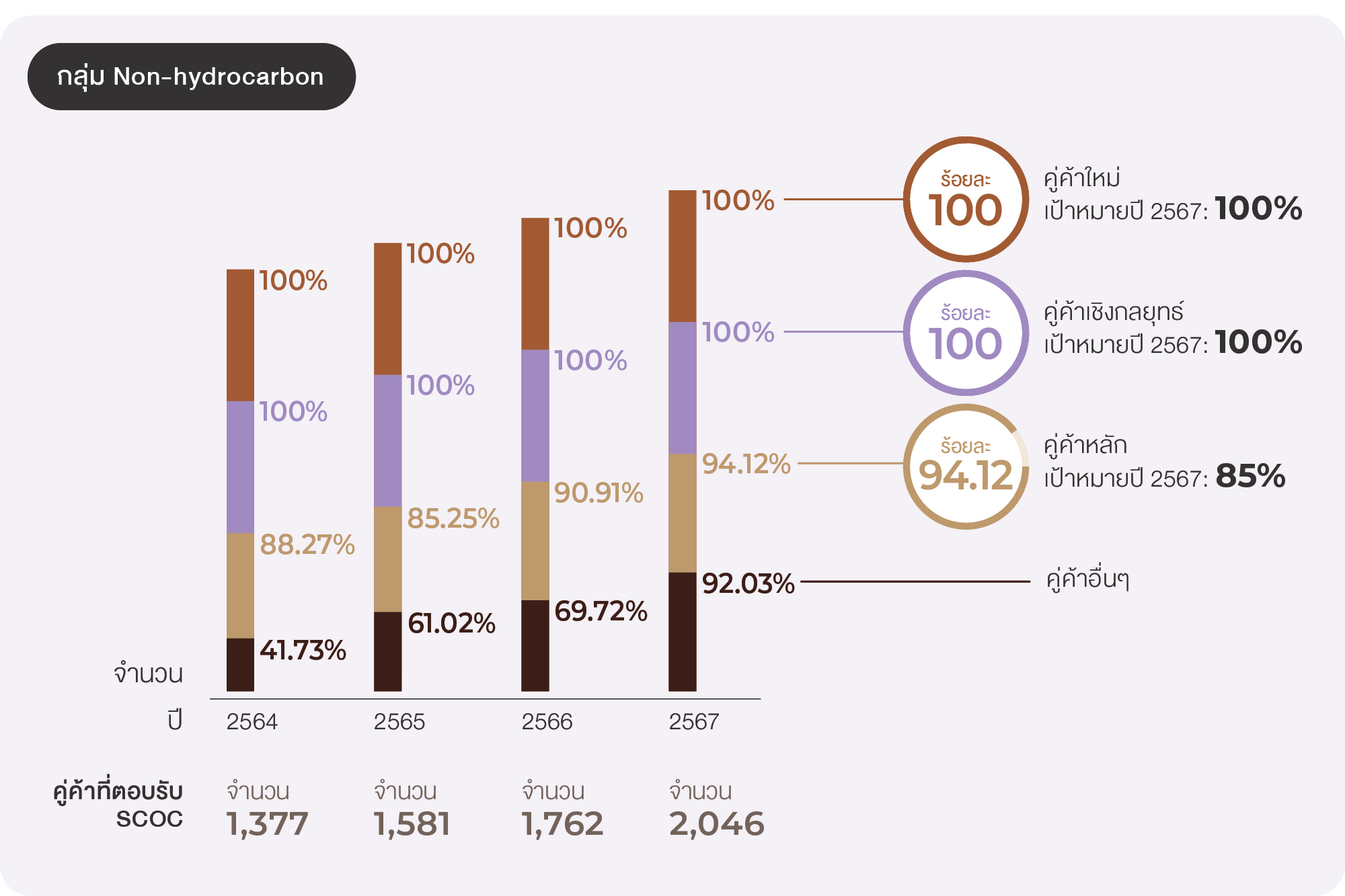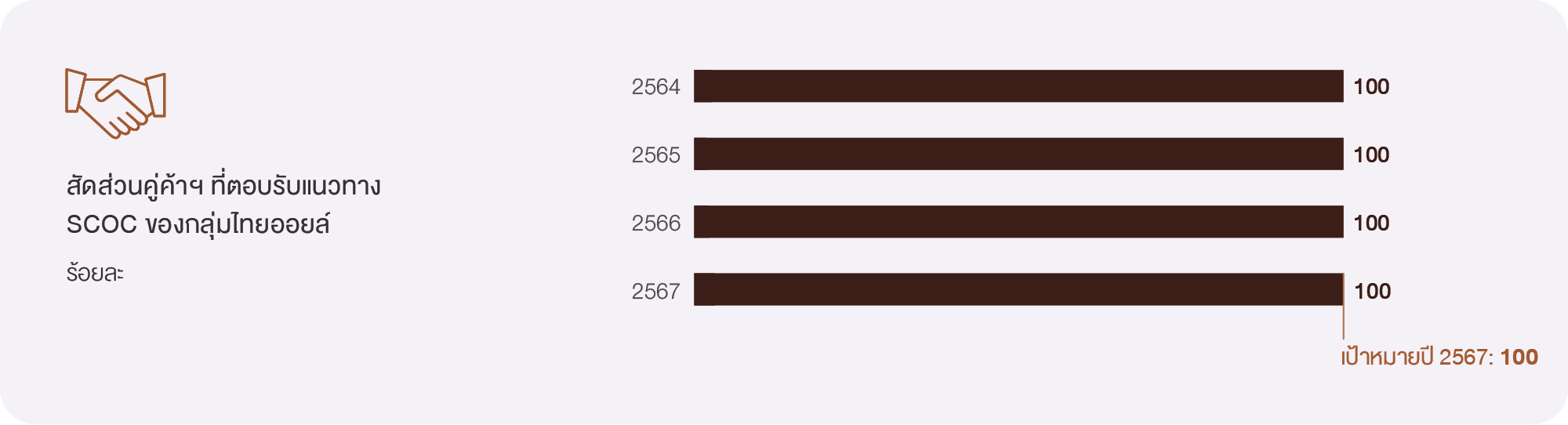 กลุ่มไทยออยล์มี SCOC เป็นแนวทางในการกำกับดูแลและสื่อสารให้แก่คู่ค้าฯ เพื่อตอบรับและปฏิบัติให้สอดคล้องกับการดำเนินงานด้านความยั่งยืนของกลุ่มไทยออยล์ ทั้งนี้ ในปี 2567 คู่ค้าน้ำมันดิบและวัตถุดิบเชิงกลยุทธ์ ร้อยละ 100 ได้ตอบรับแนวทาง SCOC ของกลุ่มไทยออยล์ และมีการดำเนินงานที่สอดคล้องกับ SCOC ของกลุ่มไทยออยล์ โดยไม่พบประเด็นความเสี่ยงด้าน ESG ที่อาจสร้างผลกระทบต่อธุรกิจ