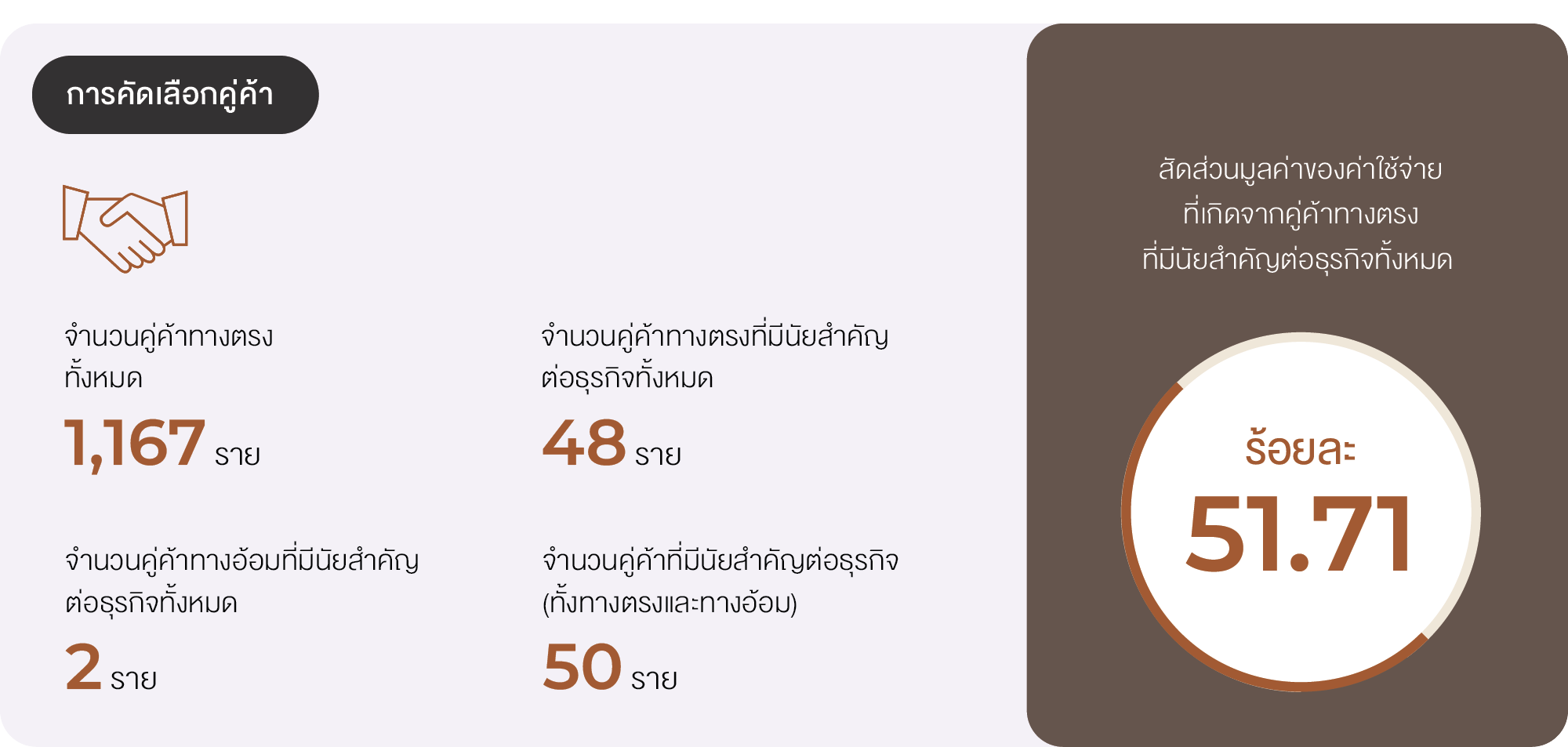 ยกระดับความร่วมมือระหว่างบริษัทฯ กับคู่ค้าควบคู่ไปกับงานจัดซื้อจัดจ้างที่เป็นเลิศและเป็นธรรมอย่างยั่งยืน เพื่อให้เกิดการเพิ่มคุณค่าด้าน ESG และนวัตกรรมร่วมกัน ได้แก่