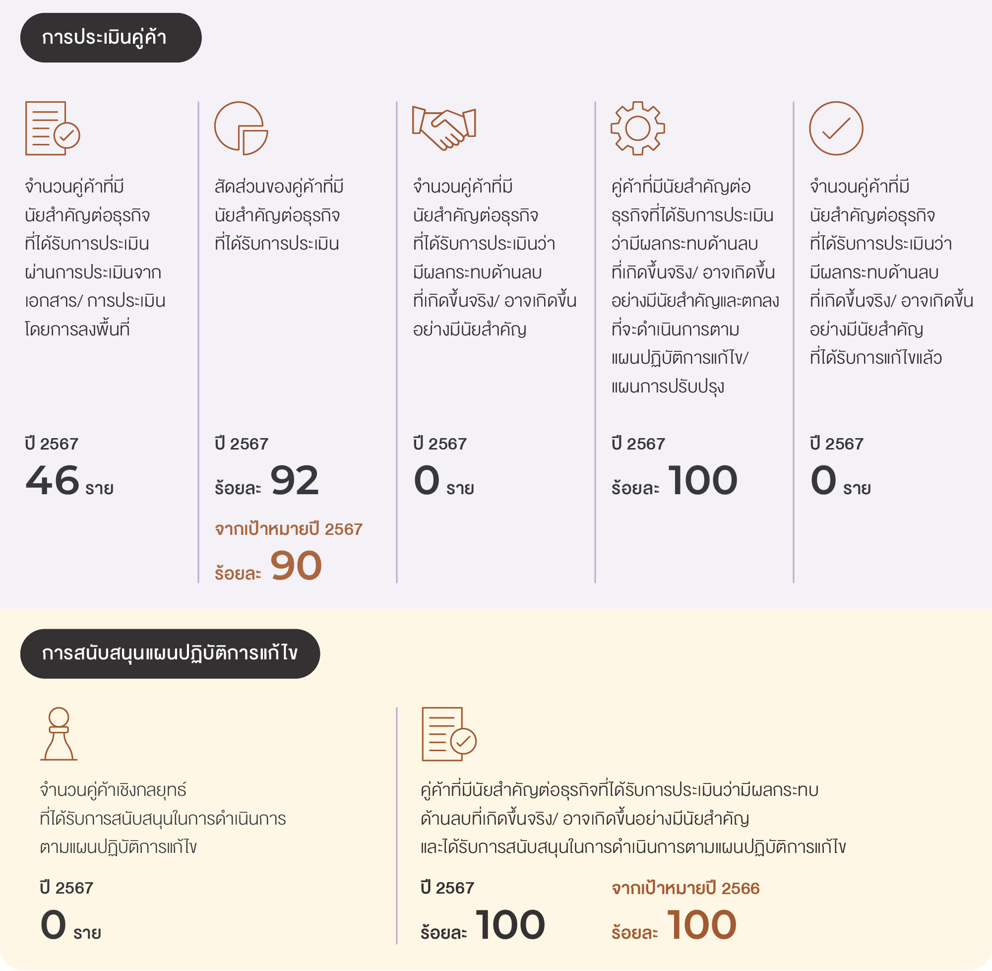 - มีการจัดโปรแกรมสนับสนุนทางด้านเทคนิคเชิงลึกเพื่อสร้างความสามารถและประสิทธิภาพ ด้าน ESG ให้กับคู่ค้า (In-depth technical support programs to build capacity and ESG performance) เพื่อปรับปรุงแนวทางปฏิบัติงานและประสิทธิภาพขอคู่ค้าอย่างเป็นระบบ ในหัวข้อ ด้าน ESG ผ่านการฝึกอบรม การประเมินเบื้องต้น การพัฒนาระบบร่วมกัน และการวัดผล เพื่อเพิ่มศักยภาพของคู่ค้าในการดำเนินธุรกิจที่ยั่งยืนในระยะยาว ด้วยแนวทางปฏิบัติที่เป็นระบบ