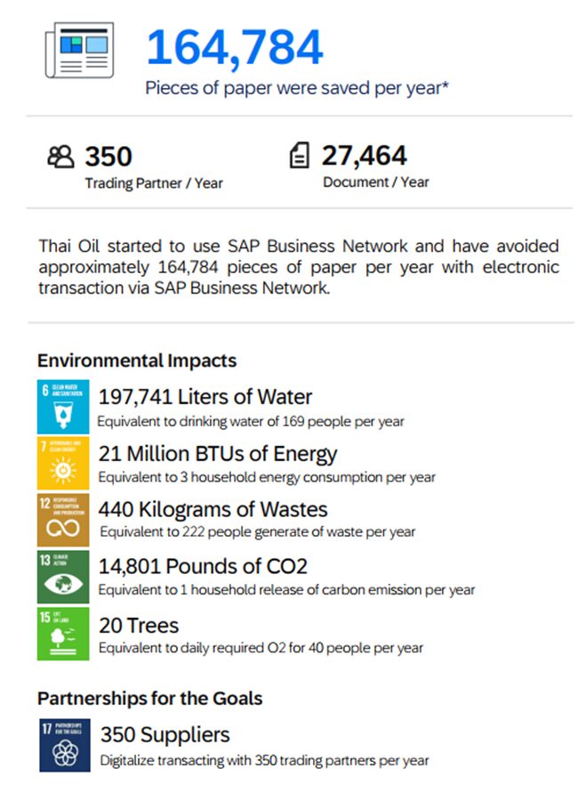 กลุ่มไทยออยล์ยังผลักดันการยืนยันใบสั่งซื้อแบบออนไลน์ (Online PO) แก่คู่ค้าอย่างต่อเนื่องผ่านระบบ E-procurement ให้มากที่สุด เพื่อช่วยลดขั้นตอนระหว่างกัน เพิ่มความสะดวกและรวดเร็วให้แก่คู่ค้า พร้อมสนับสนุนด้านสิ่งแวดล้อม จนถึงปัจจุบัน สามารถลดการใช้กระดาษไปได้ประมาณ 164,784 แผ่น/ปี หากคิดตั้งแต่เริ่มใช้ระบบจะลดได้ประมาณ 1,100,628 แผ่น จากการทำธุรกรรมผ่าน Online PO นำไปสู่การใช้ทรัพยากรและพลังงานที่ลดลง